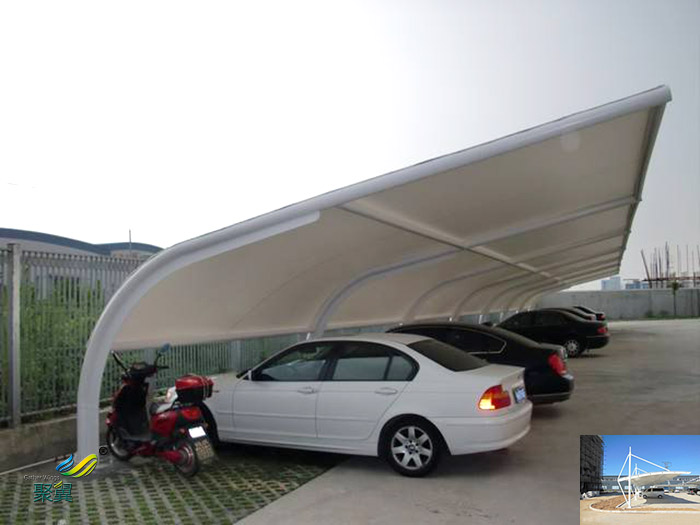 膜結(jié)構(gòu)停車棚造型美觀時尚,簡潔大方,具有空間跨度大,結(jié)構(gòu)穩(wěn)固(可抗12級臺風(fēng)),工期短,自潔防污性好,耐熱性、耐久性、防火性能強(防火B(yǎng)1級),膜材質(zhì)保十年,膜材使用壽命可達15-30年。