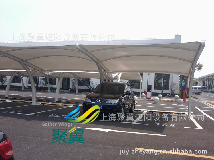 汽車遮陽棚骨架采用鋼結(jié)構(gòu)(國標(biāo)Q235)鋼管一般厚度在: 5mm 6mm 7mm 8mm 9mm材料制作而成,鋼結(jié)構(gòu)要經(jīng)過反復(fù)加工(切割、打磨、除銹、噴底漆、中間漆、面漆、成品后在做后期處理,從而達(dá)到持久不生銹效果), 面料一般膜結(jié)構(gòu)用料選用進(jìn)口及國產(chǎn)PVC涂層及PVDF PTFE膜材 膜布每平方重:950g 1100g 1200g 其厚度在:0.8mm 0.9mm 1.0mm 1.1mm.