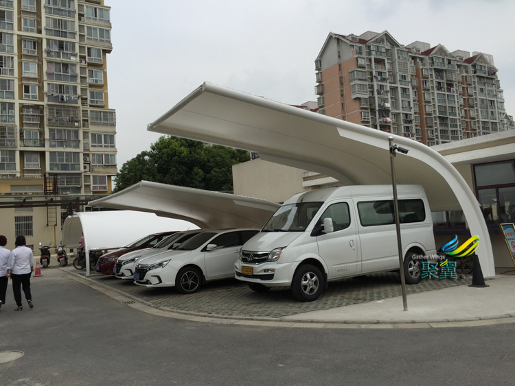 新虹社區(qū)膜結(jié)構(gòu)車棚前高3米,后高2米,不積雪,自潔防污性好;立柱間距6米,可輕松停放2輛商務(wù)轎車,不會影響車門打開;