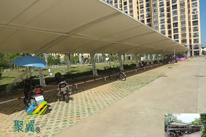 非機動車停車棚膜材料表面加涂的防護(hù)涂層(聚氟乙烯、丙烯酸等)具有耐高溫的特點。而且奉身不發(fā)粘。這樣落到膜材表面的灰塵可以靠雨水的自然沖洗而達(dá)到自潔的效果。
