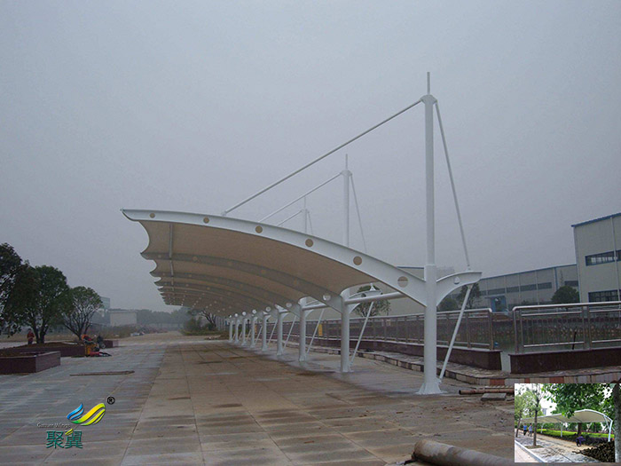 膜結(jié)構(gòu)非機動車車棚,是以建筑織物,即膜材料為張拉主體,與支撐構(gòu)件或拉索共同組成的結(jié)構(gòu)體系,它以其新穎獨特的建筑造型,膜結(jié)構(gòu)非機動車車棚良好的受力特點——成為大跨度空間結(jié)構(gòu)的主要形式之一。膜材料是指聚酯纖維基布或PVDF、PVF、PTFE等不同的表面涂層,膜結(jié)構(gòu)非機動車車棚配以優(yōu)質(zhì)的PVC組成的具有穩(wěn)定的形態(tài),并可承受一定載荷的建筑紡織品。它的壽命因不同的表面涂層而異,一般可達成10-20年。