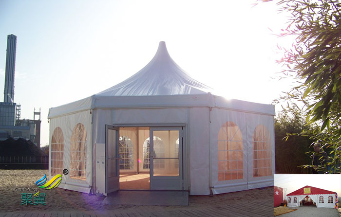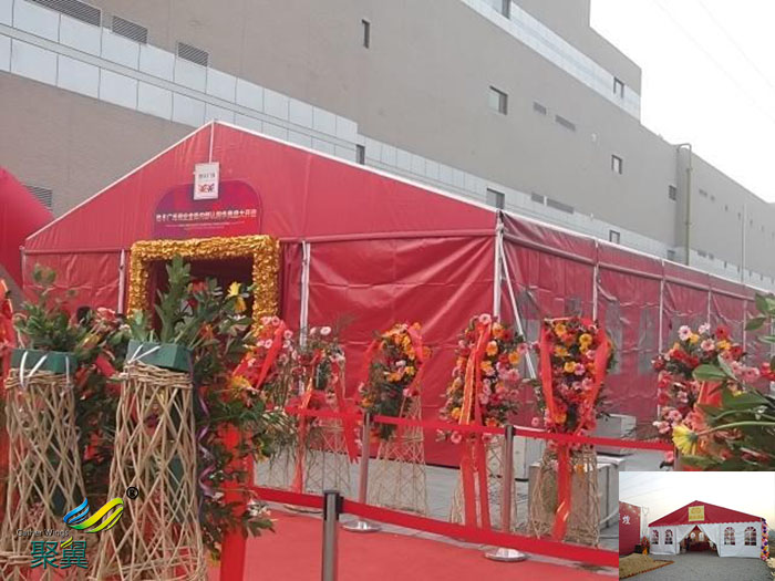 篷房 它由基原可移動框架和篷布組成,框架一般有合金和鋼為主要部件,拆裝十分靈敏便利,貯存便利,具有體積小,易運輸?shù)忍匦浴E癫际桥穹渴种匾牟考?,它的好壞直接影響部篷房的安全性,同時也與活動緊密相關(guān),因此選擇高品質(zhì)的篷布十分重要。