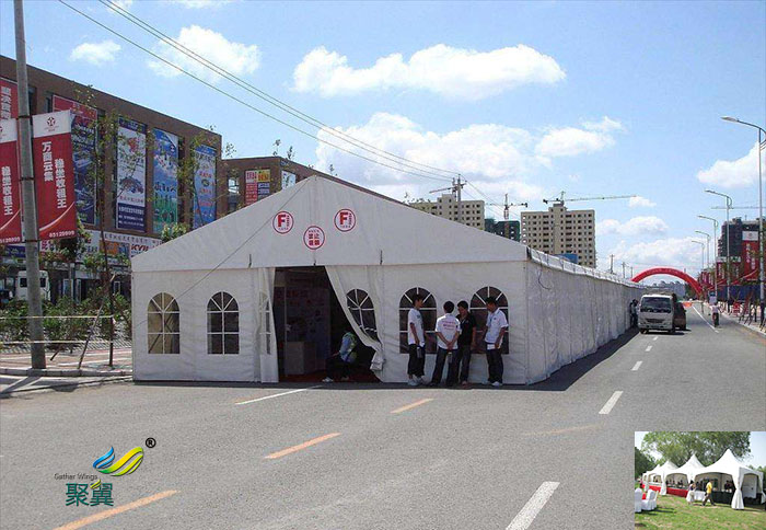 帳篷篷房主體框架為高強度特制鋁合金結(jié)構(gòu),重量輕,永不生銹。連接部位為采用國際焊接技術(shù)鋼結(jié)構(gòu),可調(diào)節(jié)式基座可彌補場地的不平,篷房采用進口雙層PVC合成纖維篷布,該篷布具有不拉伸,防紫外線的良好性能,不透光,防雨 、防火級別達到國家標準,采用高頻焊接技術(shù),篷房抗風(fēng)能力達到8 0-1 0 0公里/小時。 單位組合式結(jié)構(gòu),可根據(jù)場地的大小自由增加,對搭建場地?zé)o特殊要求,一般平地如草地、大理石地、瀝青地面、水泥地等均可 。具有體積小、高強度、長壽命、穩(wěn)定性,儲存方便,拆裝靈活、快捷易運輸?shù)忍攸c,安全性能可靠,符合歐洲質(zhì)量和安全標準?,F(xiàn)有篷房主要跨度有6米、8米、1 0米、1 5米、1 8米、2 1米、2 5米規(guī)格,根據(jù)場地的大小尺寸可靈活快速搭建,篷房內(nèi)部無任何支柱,場地得到100%使用。