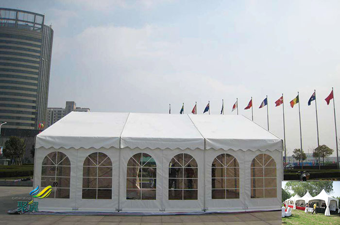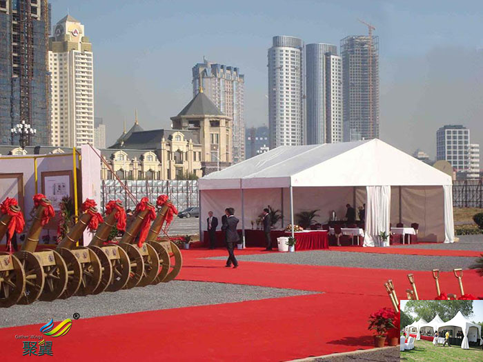 篷房屬于可拆裝移動建筑,采用高強度鋁合金和防火阻燃pvc篷布,整體重量輕,對地面要求非常小,一般只需要平整的場地即可。施工無污染,可以按需求多次移動搭拆,甚至可以做到跟隨山勢等條件搭建。