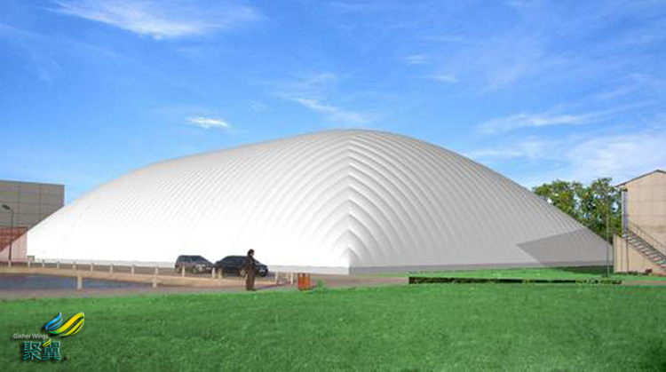 氣承式膜結(jié)構(gòu)(索膜結(jié)構(gòu))是通過(guò)壓力控制系統(tǒng)向建筑物內(nèi)充氣,使室內(nèi)外保持一定的壓力差,使覆蓋膜體受到上浮力,并產(chǎn)生一定的預(yù)張應(yīng)力,以保證體系的剛度。氣脹式膜結(jié)構(gòu)是向單個(gè)膜構(gòu)件內(nèi)充氣,使氣承式膜結(jié)構(gòu)(索膜結(jié)構(gòu))保持足夠的內(nèi)壓,多個(gè)膜構(gòu)件進(jìn)行組合可形成一定形狀的一個(gè)整體受力體系。
