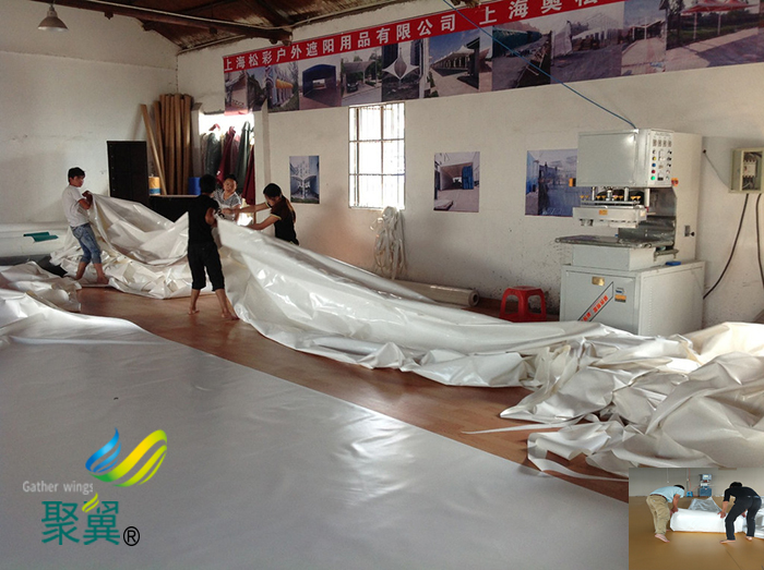 面料一般膜結(jié)構(gòu)用料選用進(jìn)口及國(guó)產(chǎn)PVC涂層及PVDF PTFE膜材 膜布每平方重:950g 1100g 1200g 其厚度在:0.8mm0.9mm 1.0mm 1.1mm.  膜布面料獨(dú)特在:(有自潔功能)易清洗、讓面料持久如新、抗老化,防凍,防雨,耐高溫,抗壓等。  面料顏色有多種,景觀篷的膜面料壽命在8年-25年不等
