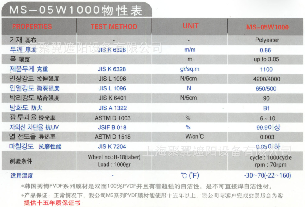MS-W系列膜材應(yīng)用的為高強(qiáng)度低收縮率的聚酯纖維基布,從而實(shí)現(xiàn)了膜材在應(yīng)用后長(zhǎng)期受力的情況下長(zhǎng)時(shí)間保證尺寸穩(wěn)定不變形,大大降低了安裝后保養(yǎng)的費(fèi)用。